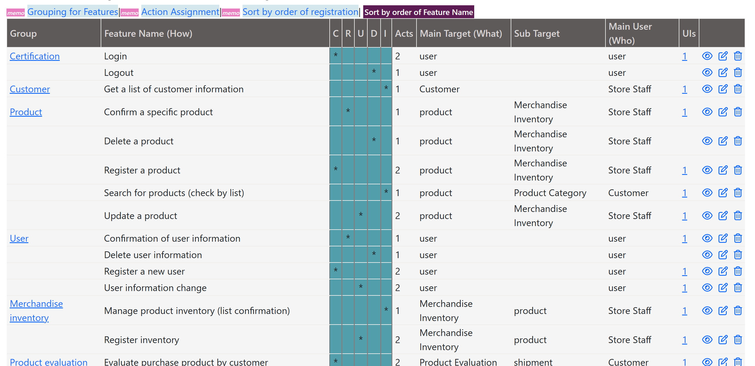 In addition, by specifying CRUDI operations (register, change, delete, search, etc.) for the targets that the features operate on, features can be automatically divided and comprehensively organized.
